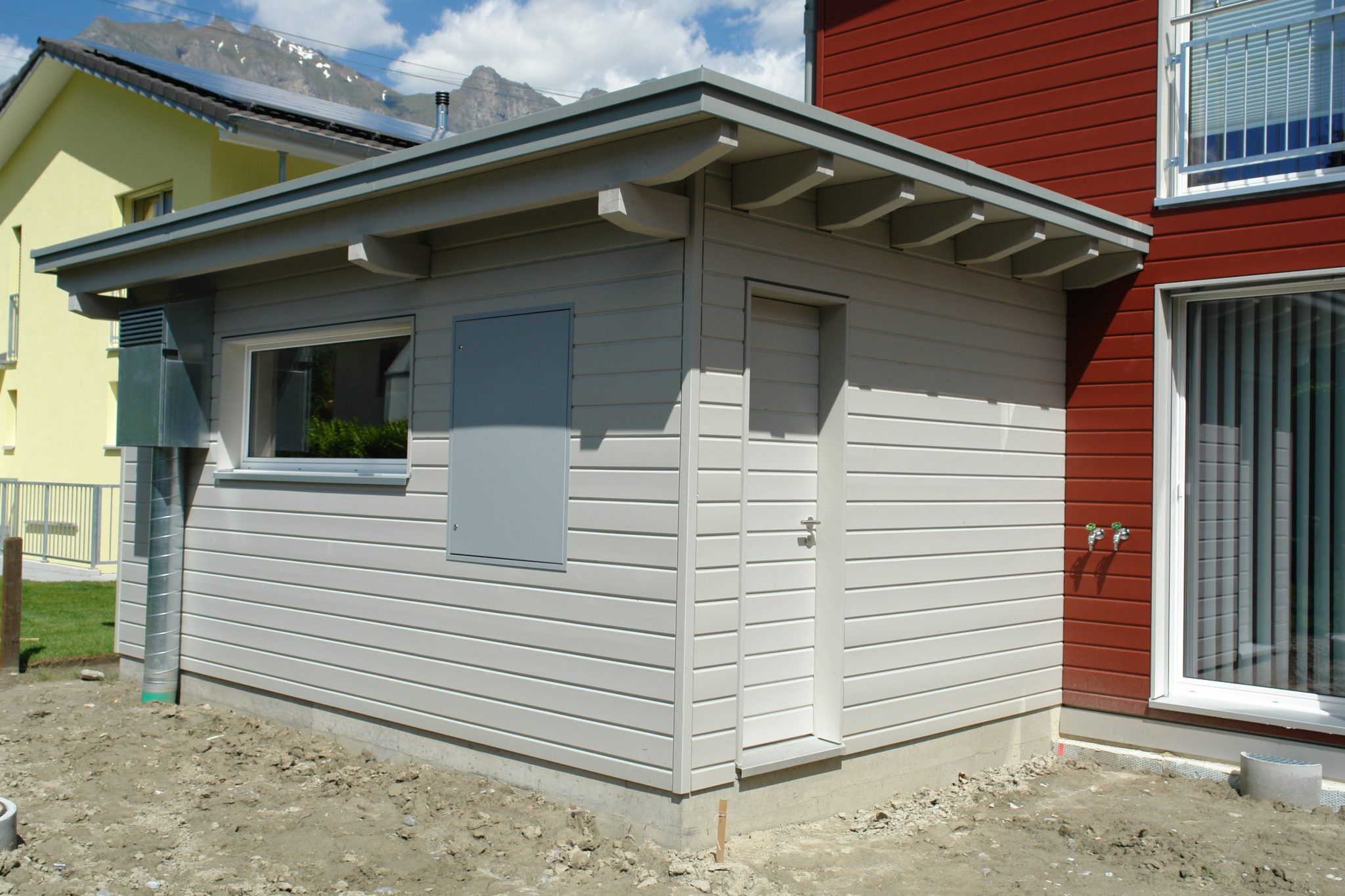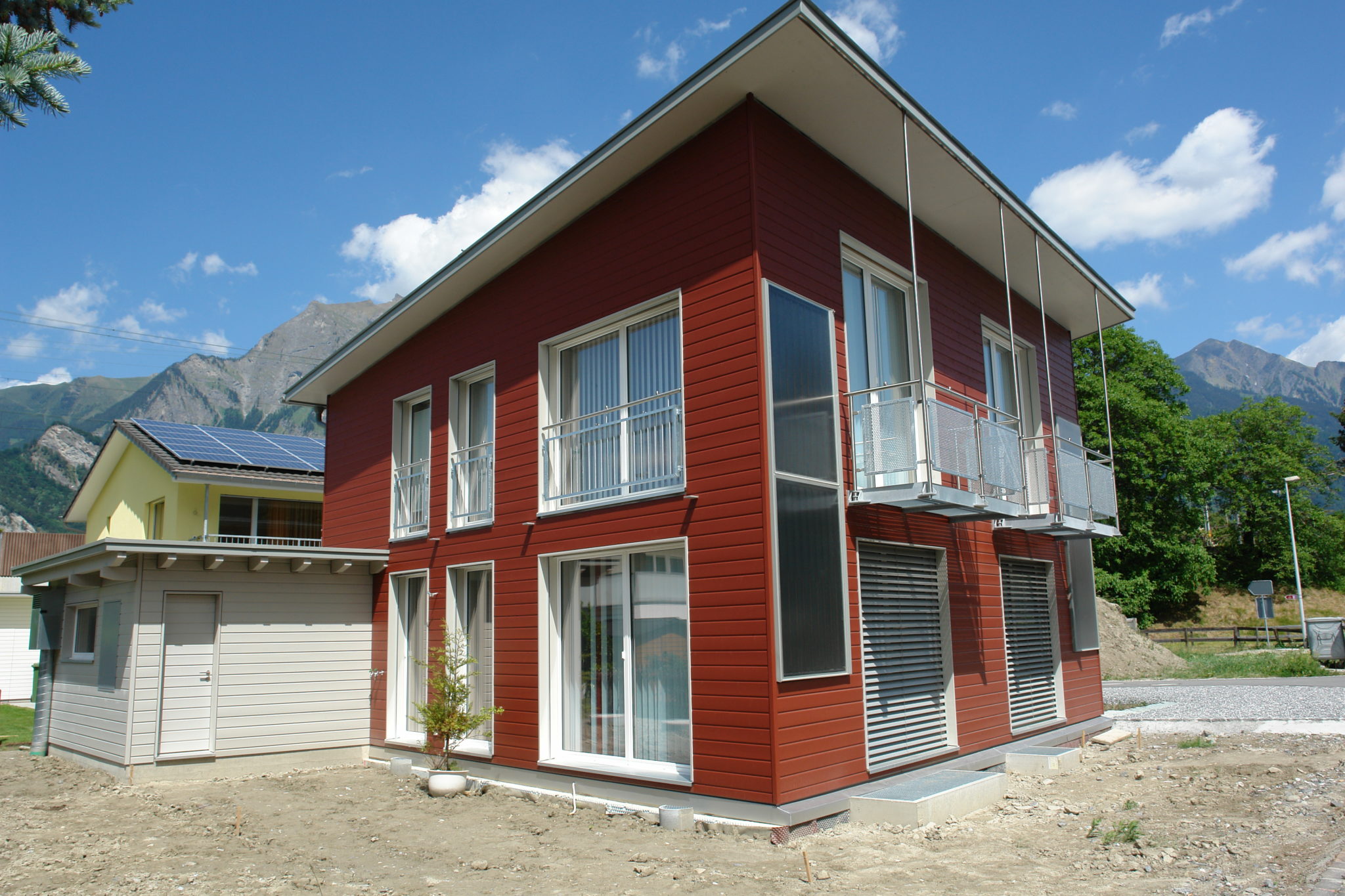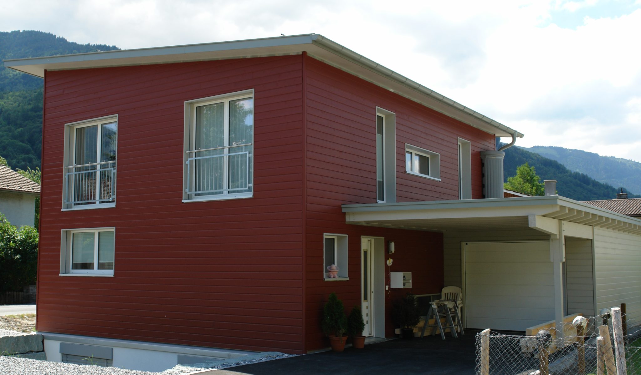 Elementhaus mit vorgehängtem Balkon, Carport und Gartenhaus.