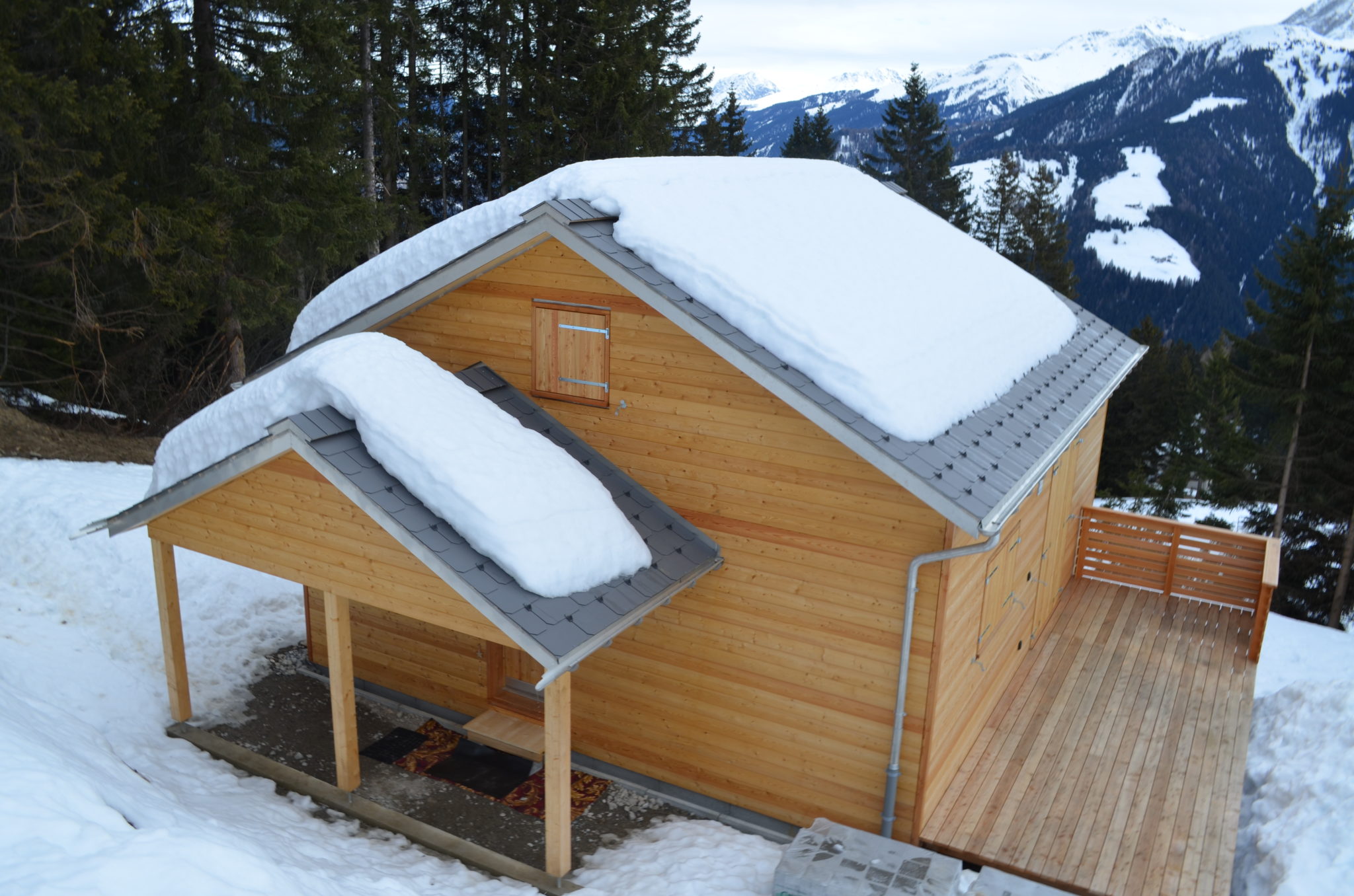 Die sichtbaren Oberflächen vom Dach wurden innen mit einem farblosen UV-Stopp behandelt, im Vordachbereich aussen wurden die Platten deckend weiss gestrichen.